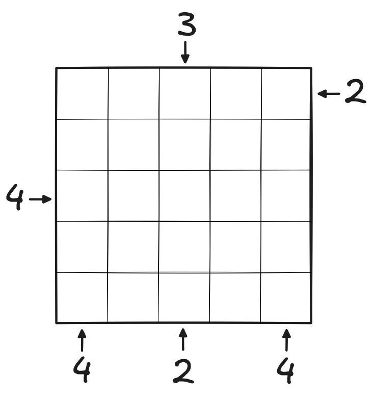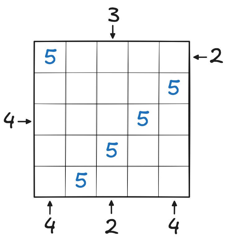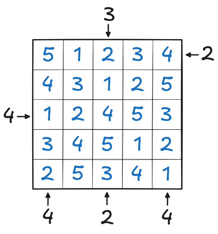 Egy lakótelepen 5×5-ös elrendezésben van 25 ház. A változatosság kedvéért 1, 2, 3, 4 vagy 5 emeletes házakat építettek úgy, hogy mindegyik fajta épület minden sorban és minden oszlopban egyszer szerepeljen.