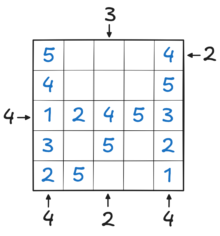 Az alsó felében szabadon maradt 4 hely kitölthető az alapján, hogy minden szám minden sorba és oszlopba pontosan egyszer kerül. Ezután a fenti hat szám is beírható, felhasználva, hogy a középső oszlopban felülről 3 épület látszik (a beküldhető válasz így az 5, 3, 4, 1, 1 volt).