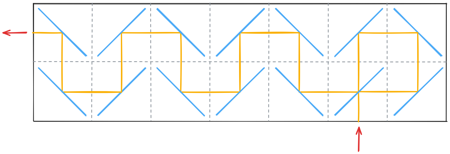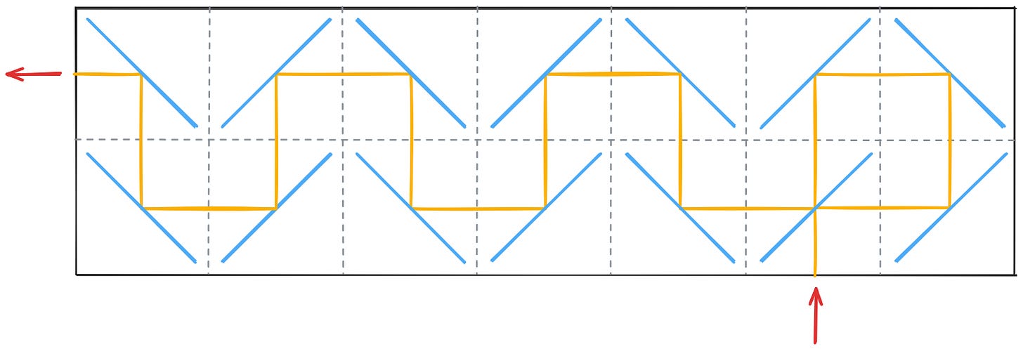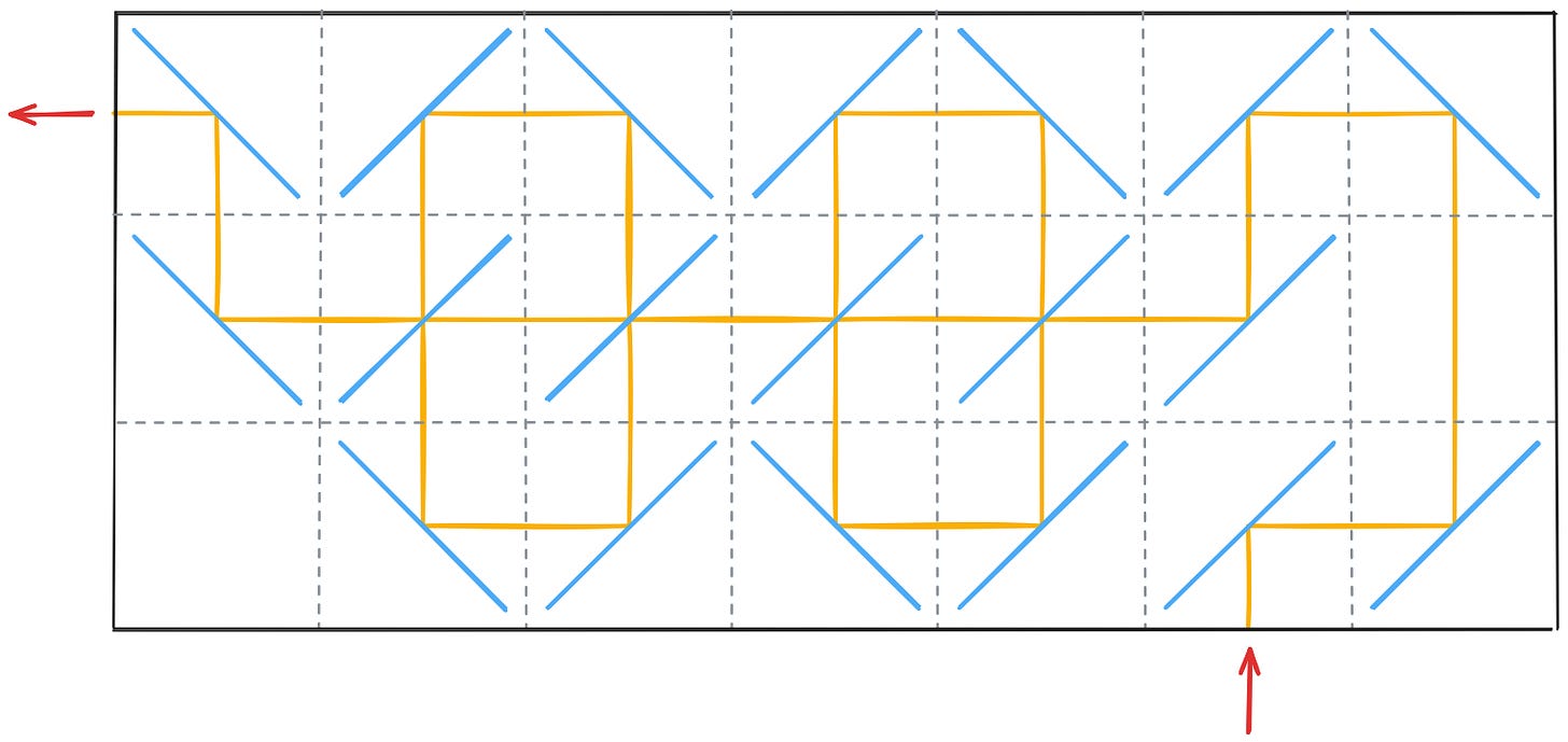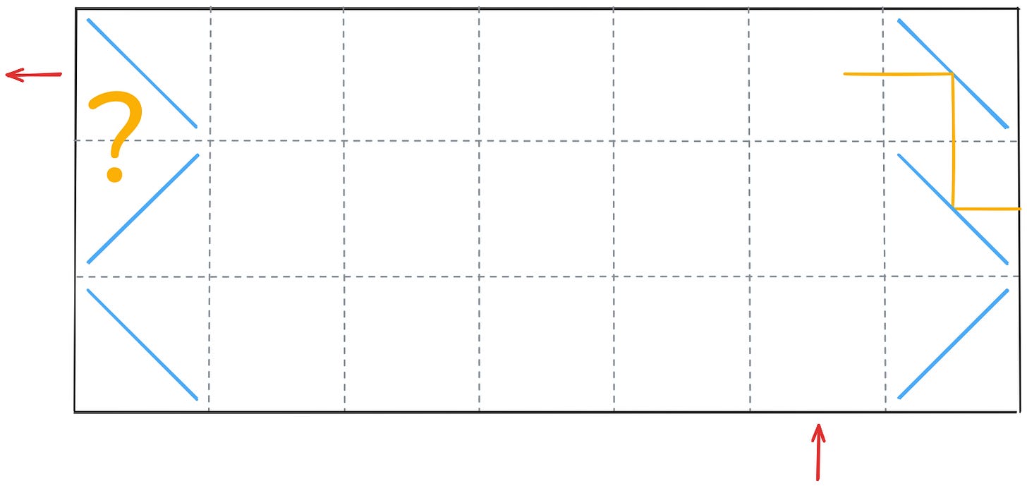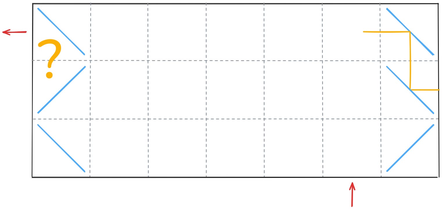 Vizsgáljuk most a két szélső oszlop mezőit. A négy sarok már fix, de azt vehetjük észre, hogy az oszlop középső mezőjére akárhogyan is teszünk le tükröt, az nem lesz jó. Attól függően, hogy pontosan honnan érkezik a fény a szélső oszlopba, az vagy nem megfelelő helyen hagyná el a termet, esetleg ki sem tudna menni a bal felső sarkon, vagy valamelyik tükröt valójában nem használná. Az alábbi ábrán ezt csak illusztráljuk, a lehetőségek végiggondolását az Olvasóra bízzuk.
