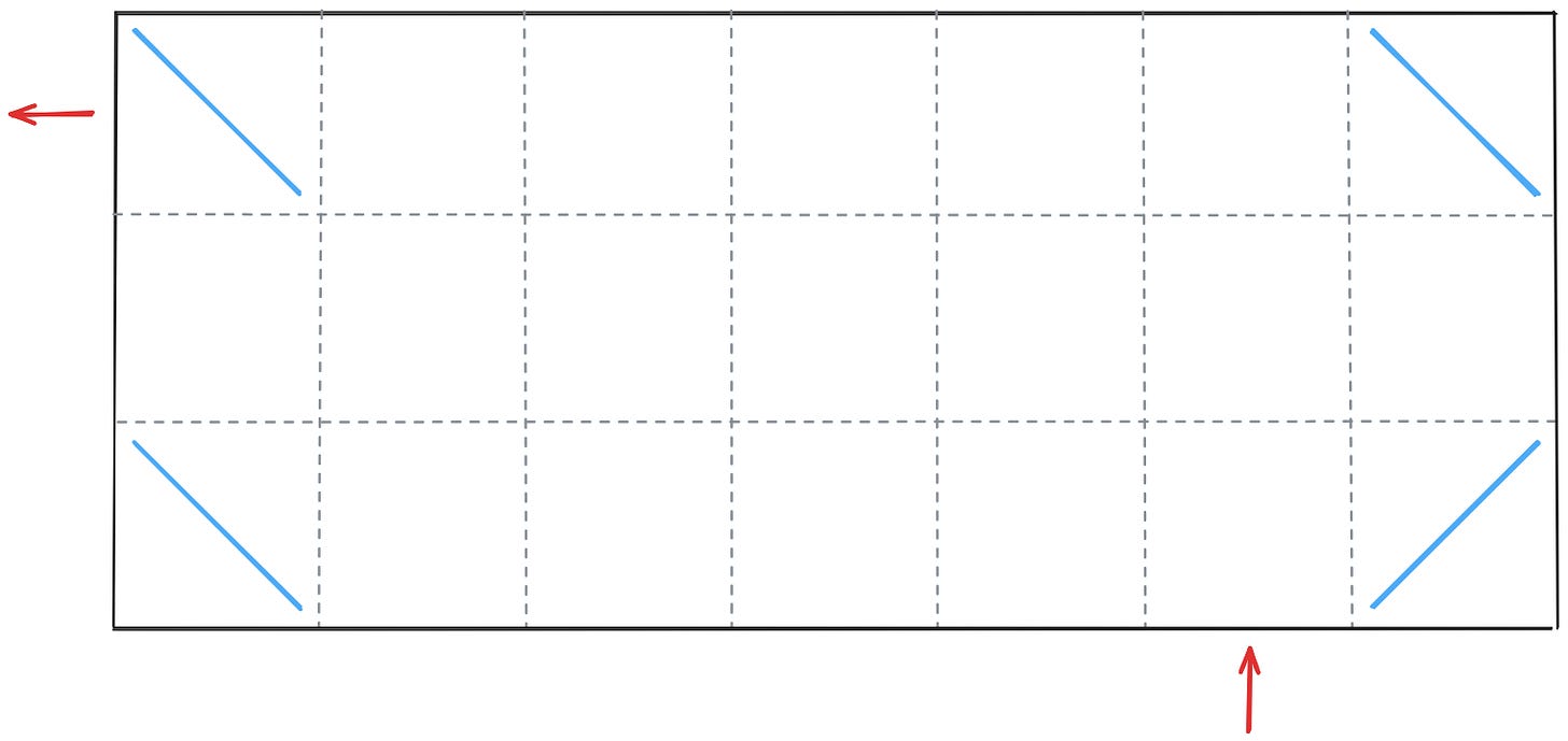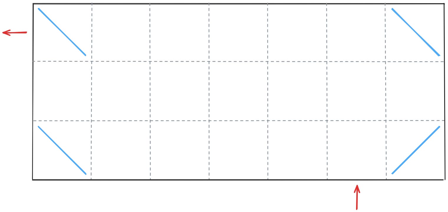 Nézzük meg, mi lehet ennek az oka. Ha minden mezőre szeretnénk tükröt, akkor a négy sarokba is kerül tükör, ezek pedig csak az alábbi ábrán látható módon állhatnak. (Ennek részletes átgondolását az Olvasóra bízzuk.)