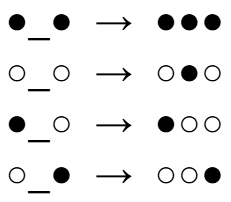Egy adott szám a szomszédai összege vagy különbsége, ezért ha a két szomszéd mindegyike páros (●) vagy mindegyike páratlan (○), akkor az adott szám páros lesz, akár az összeget, akár a különbséget nézzük. Ha a szomszédok egyike páros, a másik páratlan, akkor a köztük lévő szám mindenképpen páratlan kell, hogy legyen.